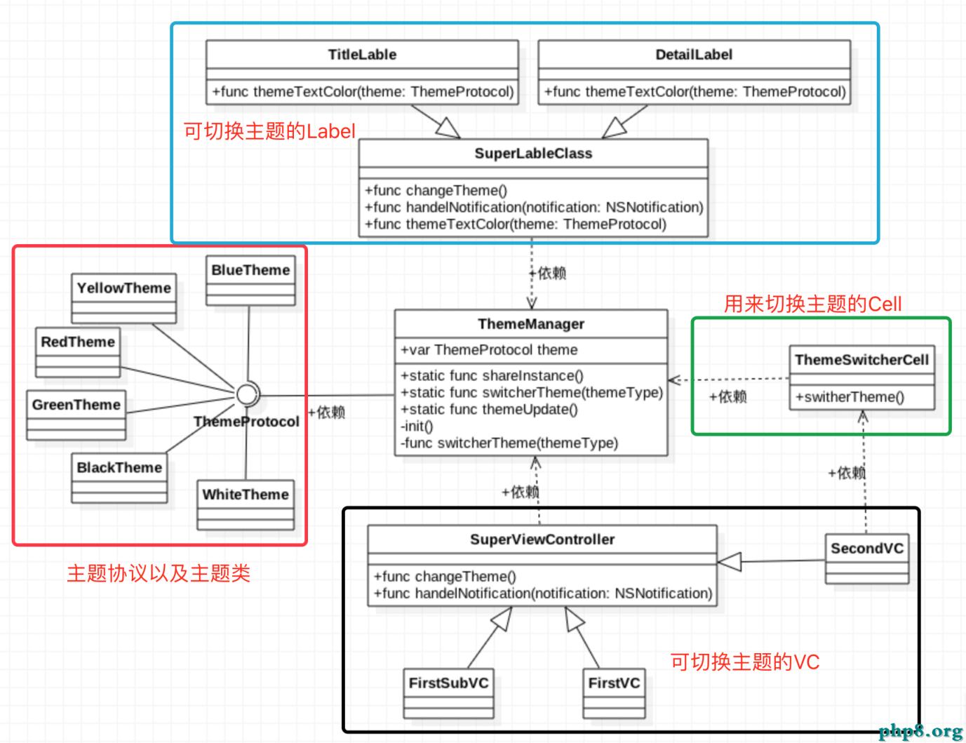 紅色框:下方類圖紅色框中就是我們的主題協議ThemeProtocol以及遵循該協議的所有主題。當然,依據“面向接口”編程的規則,外部所依賴的不是所有的主題類,而是主題協議ThemeProtocol。也就是ThemeManager類依賴於ThemeProtocol。而所有的主題類通過工廠類或者工廠方法間接的與ThemeManager。因為鑒於Swift中的枚舉中可以添加相應的計算屬性以及方法,所以我們可以使用相應的主題枚舉來充當這個工廠類,當然下方類圖中沒有給出,這個要看具體的代碼實現。