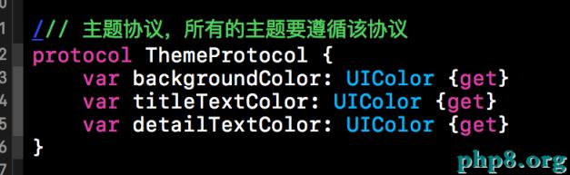 下方就是我們定義的主題協議,所有主題都要遵循該協議。因為本篇博客的Demo在切換主題時只涉及到了三個元素,一個是背景色(backgroundColor),一個是標題的顏色(titleTextColor),在一個就是詳情的顏色(detailTextColor)。所以在我們的主題協議中有三個只讀的計算屬性與之對應。具體如下所示:
