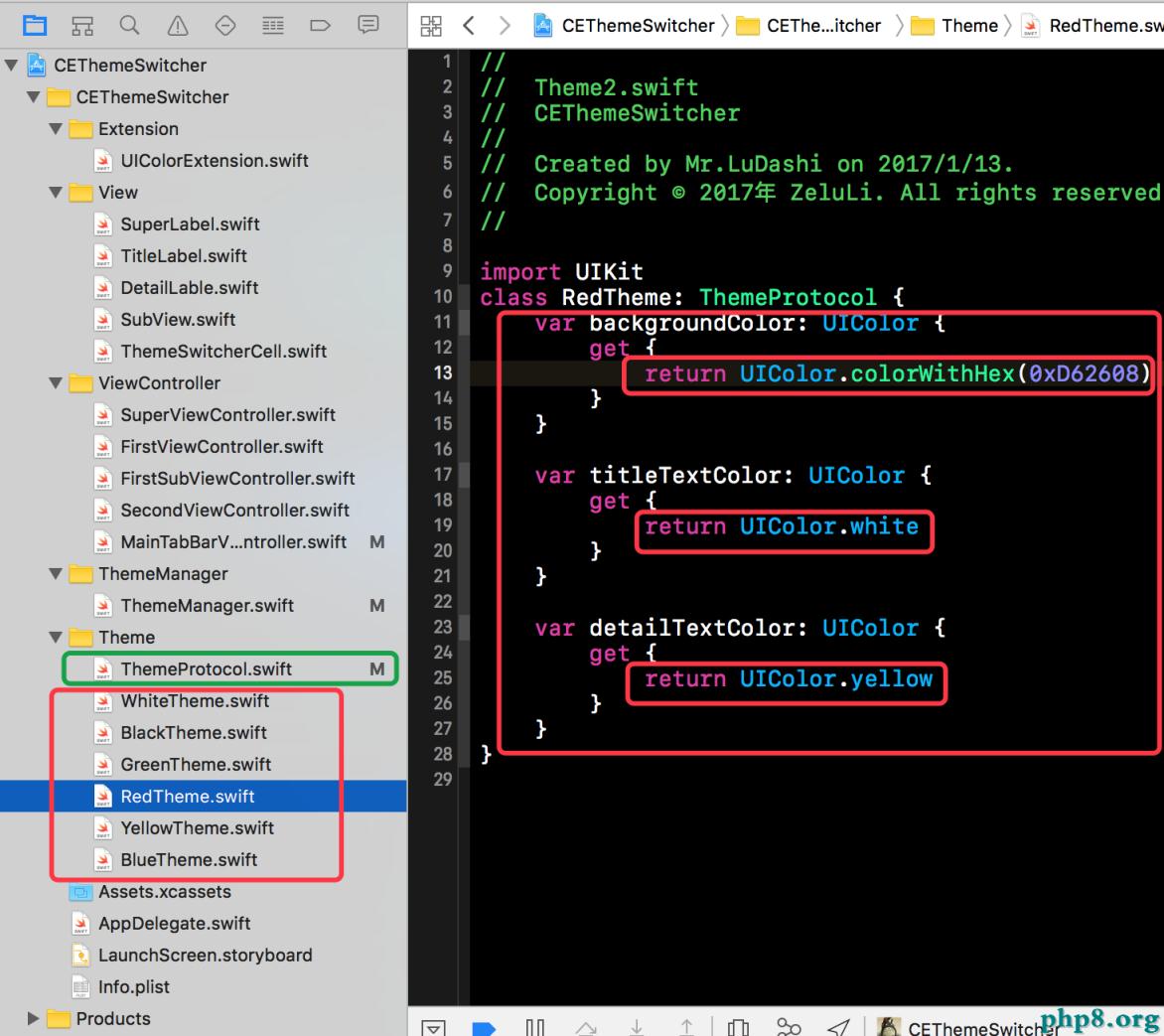 接下來我們就要看看各個主題的實現了,我們就以紅色主題(RedTheme)為例。RedTheme要遵循ThemeProtocol,並且實現協議中規定的方法。在RedTheme中每個計算屬性都會返回當前主題所對應的屬性。具體如下所示。當然其他主題與下方的RedTheme類似,只是每個計算屬性返回的值不同。