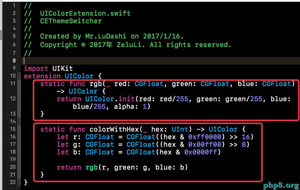 上面在返回UIColor對象時,我們用到了UIColor.colorWithHex(十六進制數)。colorWithHex()是我們在UIColor的延展中添加的靜態方法,該方法可以根據十六進制的RGB參數來初始化相應的UIColor對象。下方是該UIColor延展中的具體內容。下方代碼的核心就是位操作的使用。