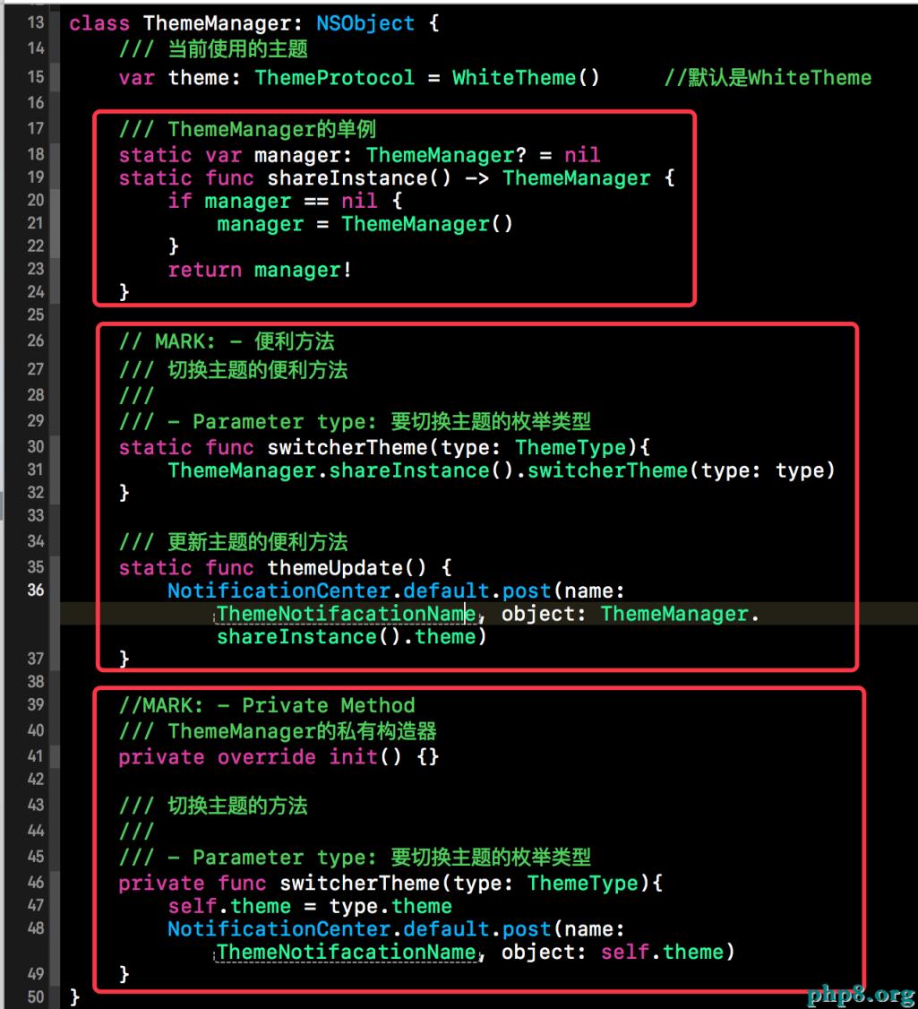 下方就是我們主題管理者ThemeManager的具體實現代碼,ThemeManager是以單例的姿態對外展現的。因為主題管理者在整個App運行時只需要一個,所以我們賦予了ThemeManager一個單例的身份與用戶進行交流。單例實現完畢後,接著社一些便利方法,這些便利方法都是靜態方法,便於用戶直接使用。接著是一些ThemeManager的私有方法。