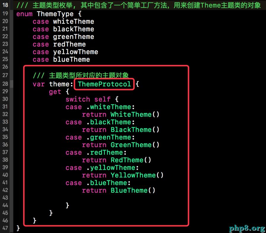 主題協議已經主題類構建完畢後,接下來我們就該將這些主題進行打包輸出了。 下方的代碼段本質上就是主題類的簡單工廠,因為Swift的枚舉類型有很多好用的特性,所以我們使用了Swift的枚舉來實現這些主題的簡單工廠。代碼結構比較簡單,在此就不做過多贅述了。