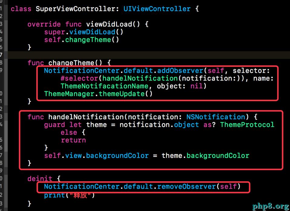 主題以及主題管理者實現完畢,接下來就該使用了。在主題切換時,需要修改屬性的控件我們需要進行處理,使其監聽主題切換的通知,並根據通知內容修改控件的屬性。在本部分我們就以SuperViewController為例。首先我們要將SuperViewController添加為主題切換的觀察者,然後實現收到通知後的方法。在析構函數中,切記要移除觀察者。具體代碼如下所示。