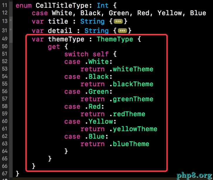 萬事俱備只欠東風,接下來我們就要在恰當的地方調用ThemeManager的switcherTheme()的方法進行替換了。當然我們是在我們的Cell來處理的,因為每種cell都對應著主題的類型,下方就是Cell類型的枚舉。CellTitleType中的themeType計算屬性就對應著相應的主題類型,我們可以將該類型提供給ThemeManager,讓後ThemeManager發出更改主題的通知。