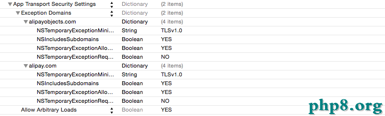 3、假如你的app基於9.0編譯,那麼為了適配IOS9.0中的App Transport Security(ATS)對http的限制,這裡需求對領取寶的懇求地址alipay.com、alipayobjects.com做例外,在app對應的info.list中添加如下配置