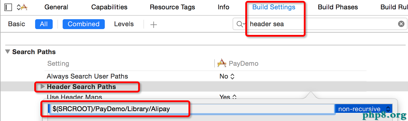 點擊項目稱號,點擊“Build Settings”選項卡,在搜索框中,以關鍵字“search”搜索,對“Header Search Paths”添加頭文件途徑:$(SRCROOT)/項目稱號。假如頭文件信息已添加,可不用再添加。