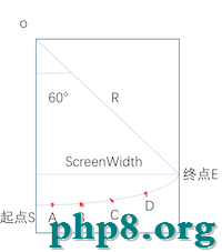 如圖,這分明是一段圓弧,那麼要確定這段一段圓弧的地位,就得確定這段圓弧的圓心和圓心角。我規則圓心在手機屏幕的左頂點,也就是(0,0),圓心角為60°。別問我為什麼這麼確定,我也是一點點嘗試的。我們先設手機屏幕的寬度為 ScreenWidth,圓弧半徑為R;那麼R = ScreenWidth/cos(60°);知道了這些開端畫圓弧。