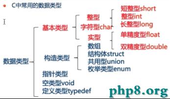 變量類型分為字符型char、整數型int、浮點型float/double、指針、構造、結合等類型。