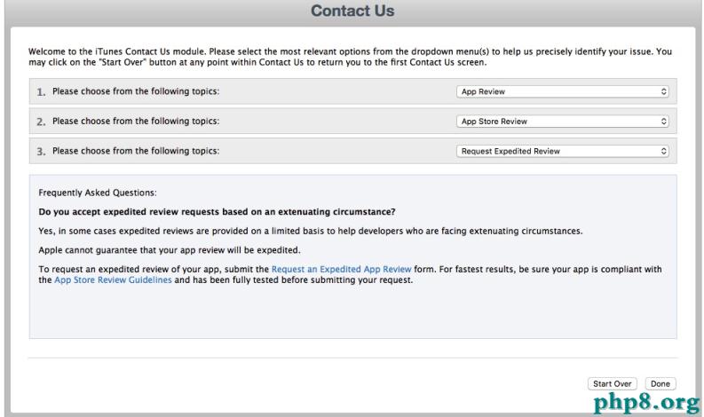 然後在Contact Us頁面,選擇“App Review” —> “App Store Review” —>” Request Expedited Review”,