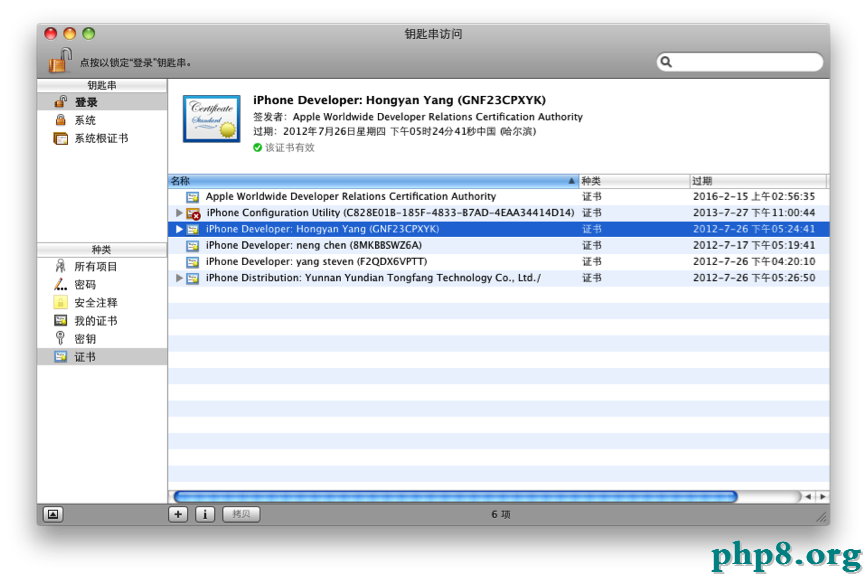 原來是鑰匙串零碎帳號和登錄帳號中的證書抵觸了。翻開鑰匙串,檢查登錄帳號中的開發者證書(留意identifier為 GNF23CPXYK 的證書):
