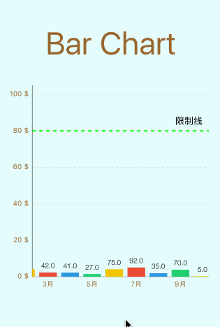 ChartLimitLine *limitLine = [[ChartLimitLine alloc] initWithLimit:80 label:@"限制線"]; limitLine.lineWidth = 2; limitLine.lineColor = [UIColor greenColor]; limitLine.lineDashLengths = @[@5.0f, @5.0f];//虛線款式 limitLine.labelPosition = ChartLimitLabelPositionRightTop;//地位 [leftAxis addLimitLine:limitLine];//添加到Y軸上 leftAxis.drawLimitLinesBehindDataEnabled = YES;//設置限制線繪制在柱形圖的前面