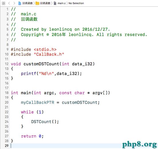 2)、main函數裡,把callBack.h的函數指針指向main的 customDSTCount,運轉 callBack.h 的 DSTCount 函數