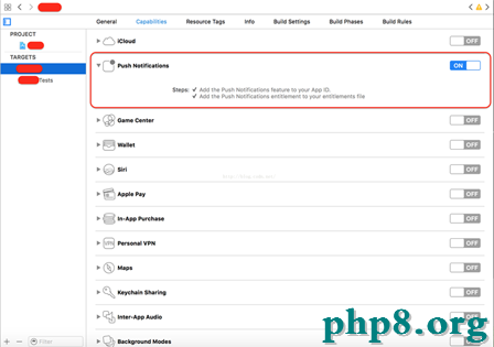 Xcode8添加了一項很重要的功用:為推送添加了entitlements 文件簽名。所以,假如你的使用是支持推送的,那一定要記得翻開這個entitlements文件簽名的開關!否則APP在啟動注冊推送服務的時分就報簽名錯誤了,Push音訊也就不能夠接納的到。