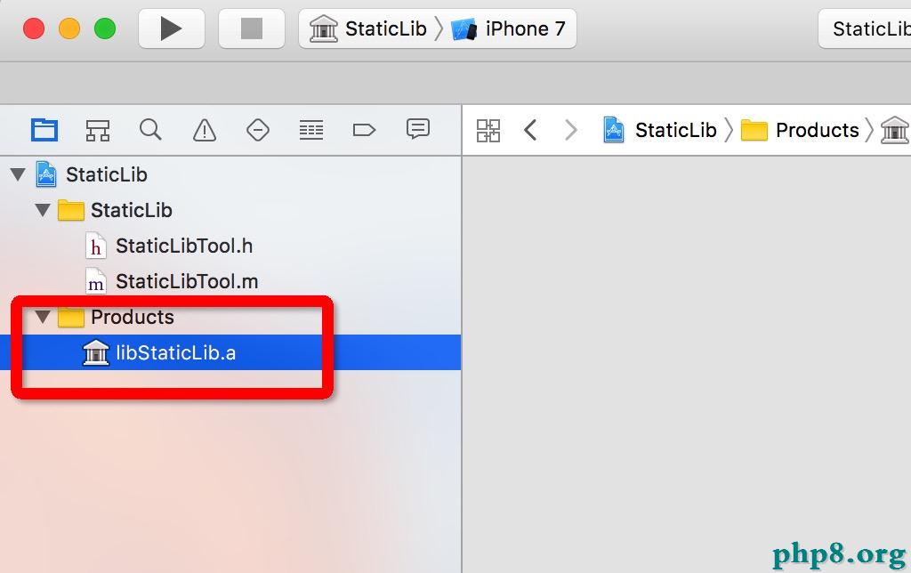 運轉終了後,我們會看到工程中Products文件夾下的libStaticLib.a文件由白色變成了黑色。右鍵show in finder可以在其目錄下找到它。這就是我們打包好的.a靜態文件了。