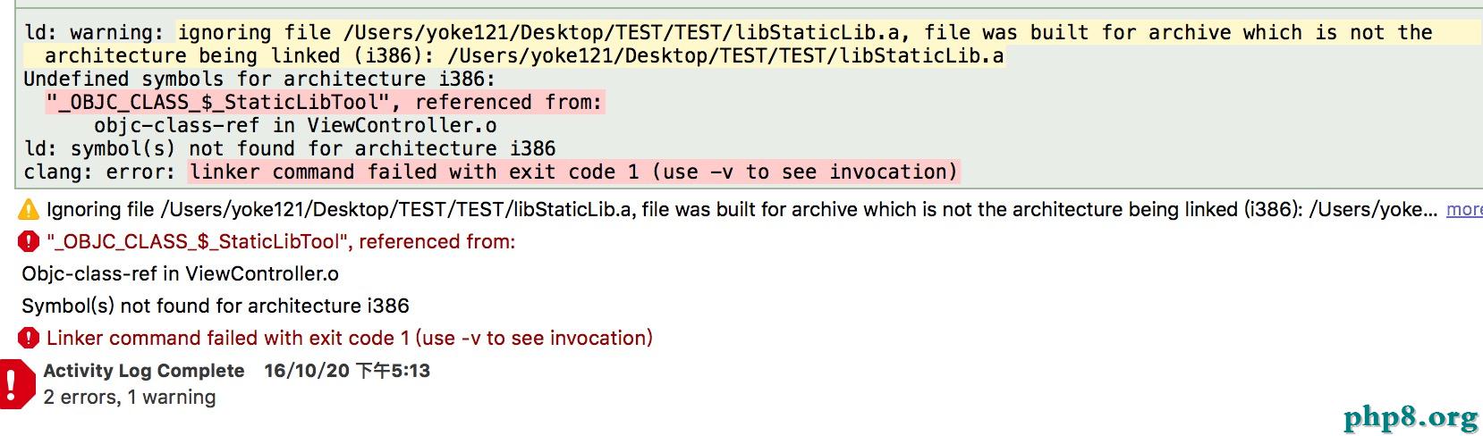 上圖“Undefined symbols for architecture i386”是什麼意思呢?意思是我們的libStaticLib.a靜態庫不支持i386架構。那i386又是什麼鬼?不清楚的可以拉上去看“iOS 設備的CPU架構”,這裡就不多做解釋了。