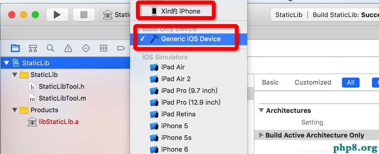 到這裡就可以進一步解釋下,打包靜態庫時,你用什麼模仿器運轉,打包出來的靜態庫就支持什麼模仿器的架構,而方才我打包時是用iPhone7運轉,所以僅支持架構x86_64。那麼這就太費事了,可以打包一個靜態庫支持多種架構的模仿器嗎?答案是一定的,請看下一步。