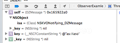 奇異的發明類的isa指針產生了變更,我們本來的類叫做DZMessage,而應用KVO後類名釀成了NSKVONotifying_DZMessage。這解釋objc在運轉時對我們的類做了些甚麼。