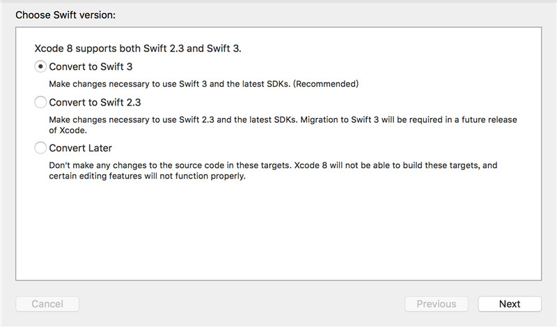 選convert後,會讓你選擇swift的版本。 假如你選擇了3.0版本的swift選項,那期待convert停止後,普通仍然有一部門須要你做手動適配。 假設你臨時不想消費時光做swift版本的適配,你可以選擇swift2.3版本,convert其實不會轉換任何內容,你的項目也能夠像以往在Xcode7中那樣正常運轉。此時我們選擇swift2.3: