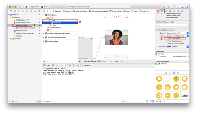 但是有的童鞋在使用了上面的代碼運行後可能會出現方框不存在(即沒有識別人臉)這種情況,這是由於忘記關閉Auto Layout以及Size Classes了。 選中storyBoard中的ViewController,選中view下的imageView。然後在右邊的面板中的第一個選項卡中找到use Auto Layout ,將前面的✔️去掉就可以了