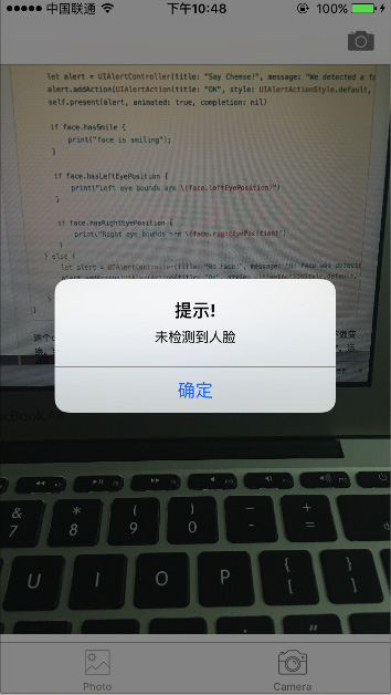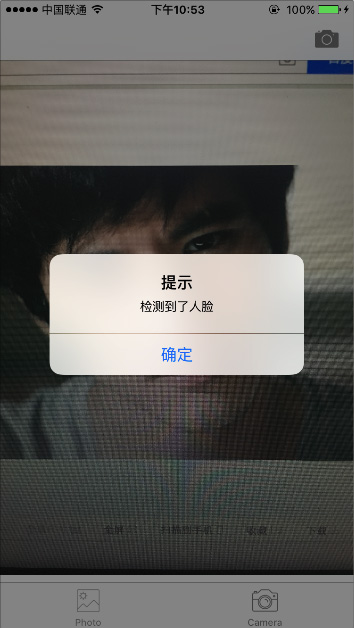 這個detect()函數與之前實現的detect函數非常像,不過這次只用它來獲取圖像不做變換。當識別到人臉後顯示一個警告信息“檢測到了人臉!”,否則顯示“未檢測到人臉”。運行app測試一下: