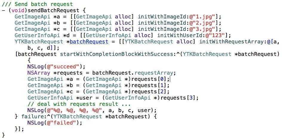 話不多說直接上代碼在YTKNetwork裡負責進行網絡批處理請求的是YTKBatchRequest類,下面看下它的使用示例: