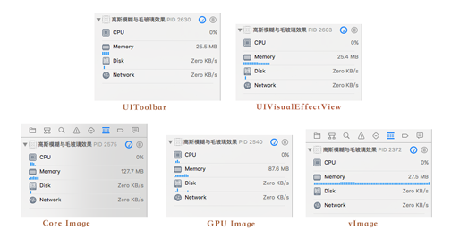 UIToolbar和UIBlurEffect都是在圖片上方生成一個蒙層,都可以設置模糊的范圍;而其他三種方式都是對原來的圖片進行模糊處理返回渲染後的一整張圖片,相對來說比較耗性能。圖1-2 是實測五種方式的內存占用: