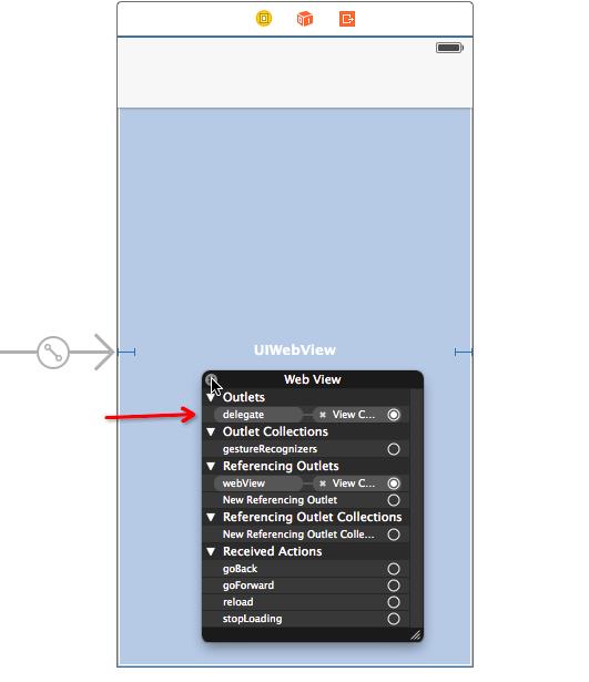1.需要有一個webView,可以通過storyboard拖拽一個 或者 alloc 一個(我在這裡是拖拽了一個),是否要給webView設置delegate ,根據自己的需要決定(如果只是展示頁面可以忽略)。
