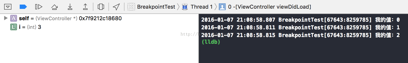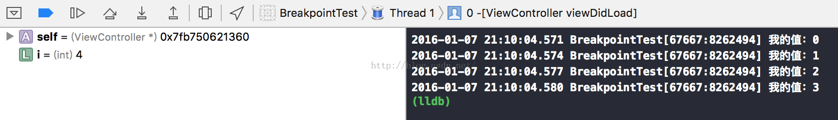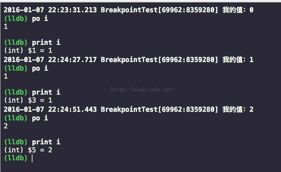 Xcode中使用llvm編譯器,公認為最好的C、C++、OC、Swift編譯器。而lldb是llvm中的調試器,我們可以使用一些簡單的命令進行調試,我還是把上面的循環代碼作為測試代碼。