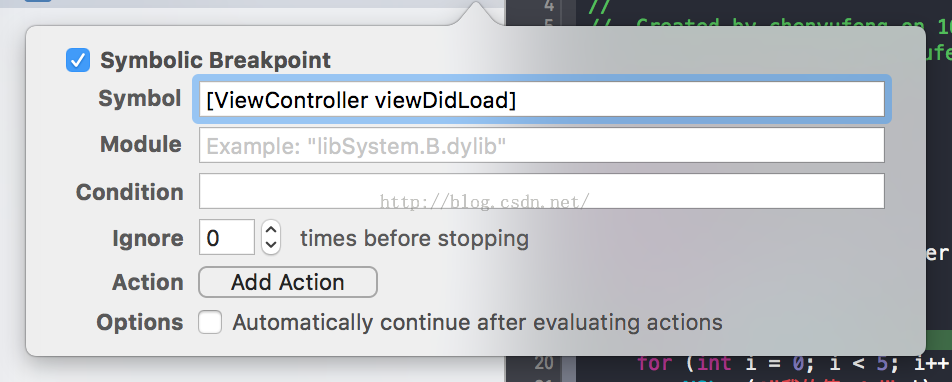 配置符號斷點如下:可以當執行到ViewController類的viewDidLoad方法時中斷執行。