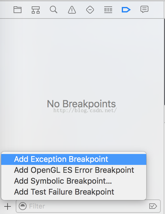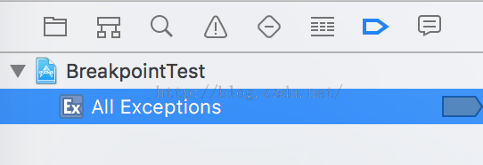 斷點的功能不限於上面所述。開發iOS知道,如果我們因為異常然後程序crash了,代碼就直接跑到main.m的main函數中去了。為什麼就不能跑到出現異常的代碼中呢???異常斷點就為我們解決該問題,程序就會在異常出現的那行代碼終止。創建異常斷點圖例如下: