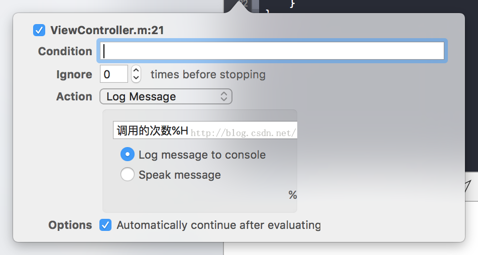 同時,還可以查看某個函數被調用的次數,設置Action參數如下,注意要選中Automatically continue after evaluating actions.