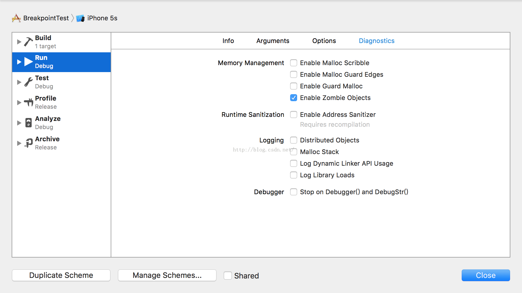 iOS中把那些已經release但還沒完全消失的對象叫做僵屍對象,對已經release的對象再次釋放,就會發生異常。雖然自從使用ARC後,由於對象釋放產生的異常已經大大變少,但偶爾還會出現。開啟僵屍對象模式後,就能快速定位到異常位置。開啟方式如下:Product-->Scheme-->Edit Scheme. 勾選Enable Zombie Objects即可。