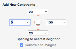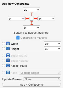 仔細檢查top、leading、trailing、bottom中的數字並確保它們的I型柱都被選中。然後點擊Add 4 Constraints: