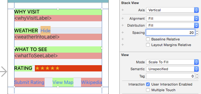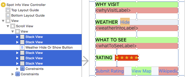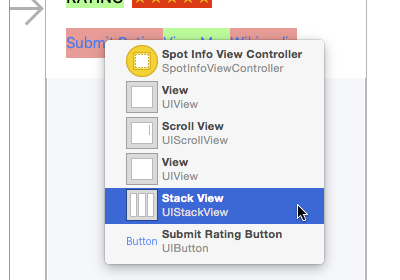 打開Main.storyboard,找到Spot Info View Controller這個Scene。哇!在你的Stack View上有很多顏色!