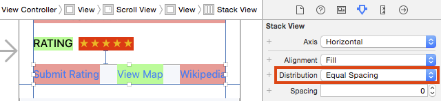 確保Stack View處於選中狀態,打開屬性面板。將Distribution屬性由Fill修改為Equal Spacing: