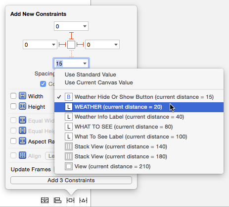 默認,約束是相對於距離最近的對象,對於Bottom約束來說就是距離它15像素的Hide按鈕。但我們其實是想讓約束相對於WEATHER標簽。
