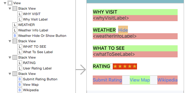 將各版塊轉換到Stack View我們將把SpotInfoViewController中的所有版塊都添加到Stack View中。這將有助於我們完成剩下的任務。接下來我們先調整Rating版塊。