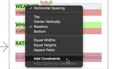 右鍵從Hide 按鈕拖一條約束到 WEATHER標簽,按下 Shift 鍵,同時選擇 Horizontal Spacing 和 Baseline。然後點擊 Add Constraints: