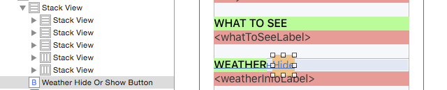 噢!這個 Hide 按鈕又失去了它 的約束!因為包含 WEATHER 標簽的Stack View的外邊又套了一層 Stack View。這不是什麼大問題,就像之前你做過的那樣,再重新為它添加約束就是了。