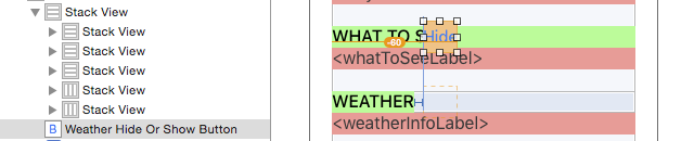 這是因為WEATHER標簽是嵌在 Stack View 中的,任何它和 Hide 按鈕之間的約束都被刪除了。