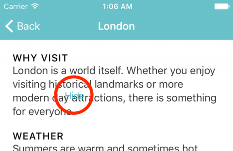 點擊WEATHER旁邊的Hide按鈕。它成功地隱藏了文本,但它下面的內容卻保持在原來的位置,從而留下了一大塊的空白區域。