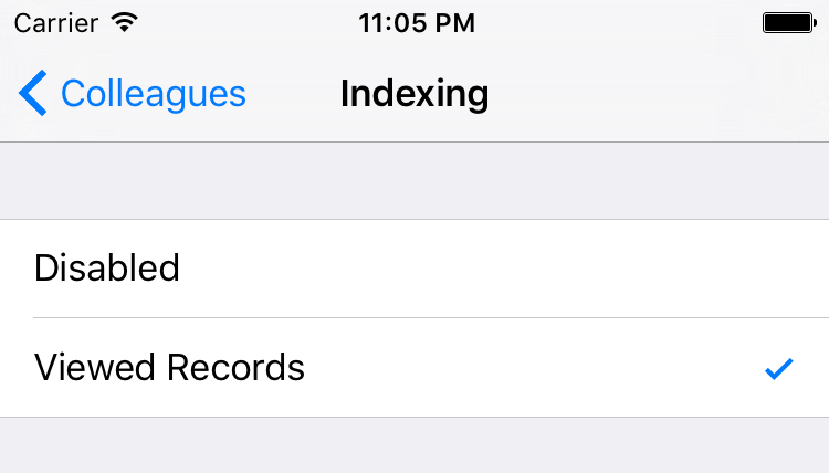 在模擬器或設備上,打開設置程序,找到 Colleagues。將 Indexing 設置改成 Viewed Records。
