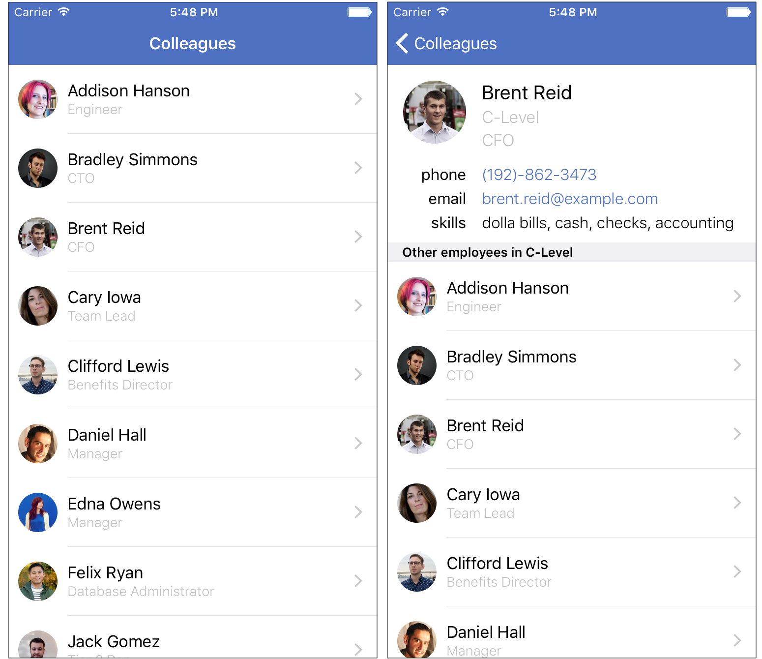 你將學習的示例程序叫做 Colleagues,它模擬一個公司通訊錄。它可以將你的同時添加到你的聯系人中,而不是直接給你一個同事的目錄。為了簡單起見,它使用的是本地數據庫,由一個文件夾(存放頭像圖片)和一個 JSON文件(包含了所有公司職員信息)組成。在生產環境中,你應該使用一個網絡組件從 Web 上抓取這些數據。作為教程,JSON 文件就足夠了。下載並打開初始項目,不需要做任何事情,直接編譯運行。