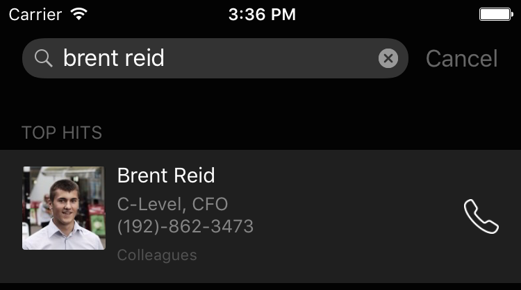 現在所有的數據都准備好了,Core Spotlight 在搜索時會檢索這些數據並添加到搜索結果中。這樣,用戶就可以搜索同事的姓名、部門、稱謂、電話號碼、email甚至是技能。