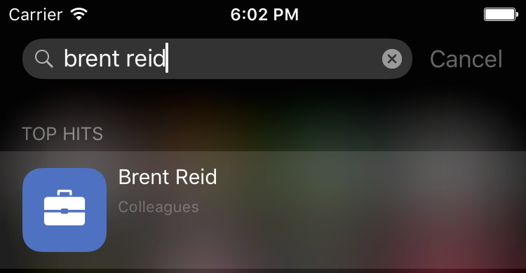 編譯運行。查看 Brent Reid 的個人信息以便索引生效。回到 Home 屏幕,拉出 Spotlight,搜索 brent reid。如果你先前的搜索結果仍然存在,你只需要清除並重新搜索。