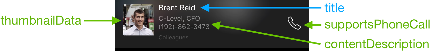 要顯示”打電話“按鈕,我們必須將 supportsPhoneCall 設置為true,並給 phoneNumbers 屬性賦一個數組。最後,我們設置了 email 地址,並將同事的 skills (技能)作為 keyword 關鍵字。