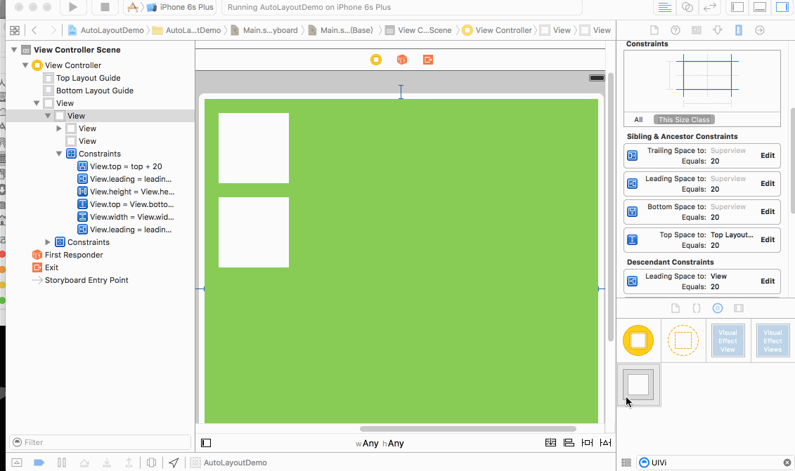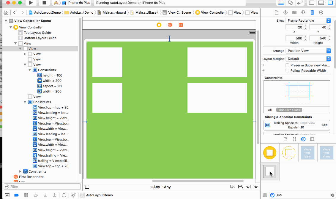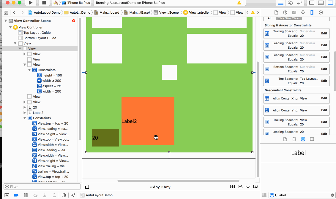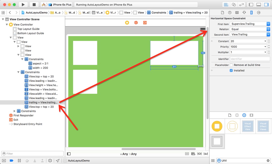 比如圖中的View 約束 可以理解為 View的tralling(右側) 等於(eauql) 1倍(multpiler)的控制的右側 + 20(constant)