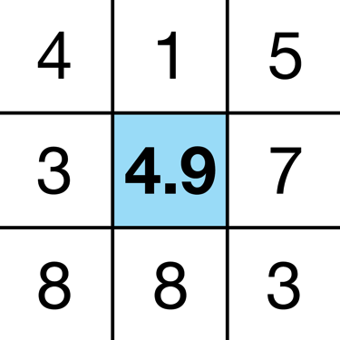 每一個小格子代表了一個獨立的像素,每個像素點有一個介於1和10之間的值。假設我們要對中心的像素點進行模糊化,那就需要計算四周八個像素中的值的算術平均數,並將這個數作為中心像素的值插入進去。結果如下圖: