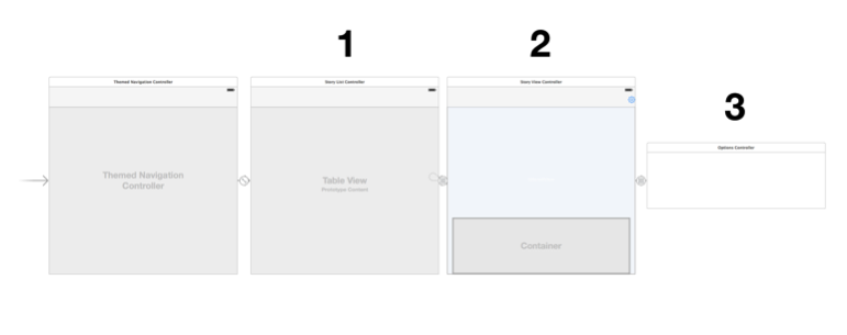 你可略過上圖中最前面的那個視圖控制器,因為它在App中只不過是個簡單的底層導航控制器。你需要關注的是後面有編號的視圖控制器:
