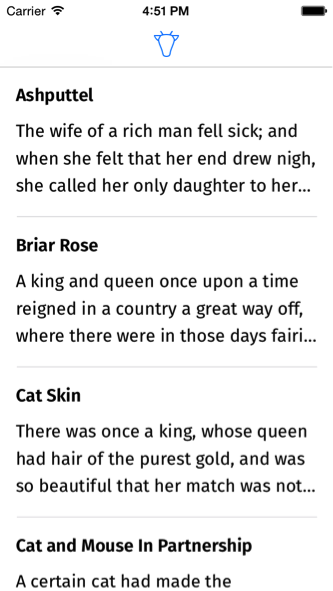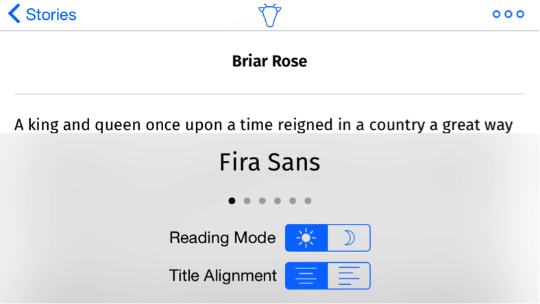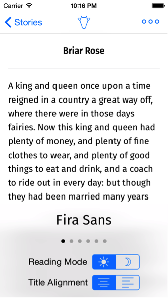 你可以體驗一下這個應用,選好童話之後,點擊省略號喚出選項視圖來切換不同的字體和閱讀模式,這樣可以了解用戶界面的基本功能。